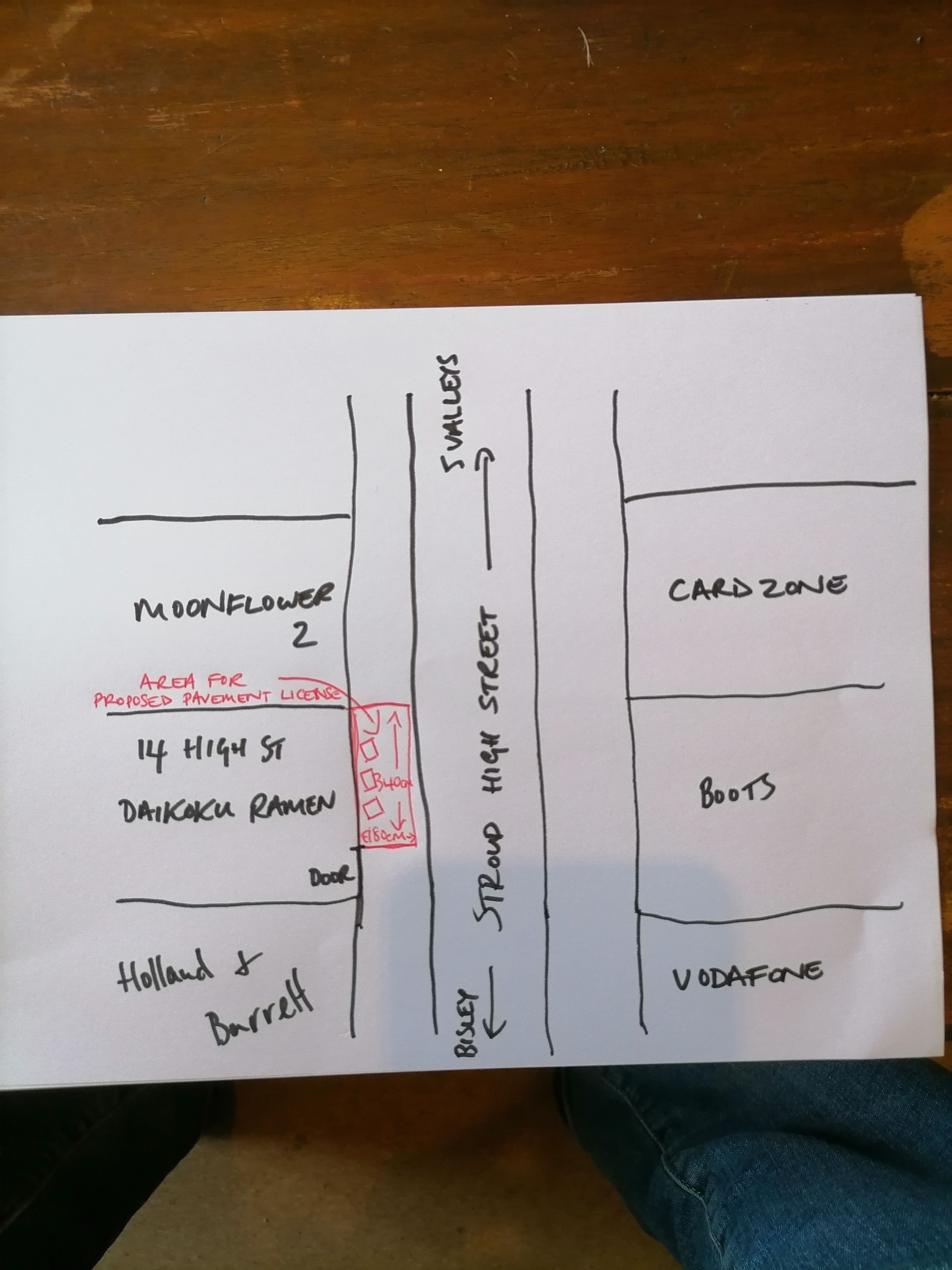 Application for a Pavement Licence to place tables and chairs outside the front of Daikoku Ramen, 14 High Street, Stroud . The number of tables and chairs applied for in this application are: 3 sets of tables and chairs to accommodate 4 persons (per set).